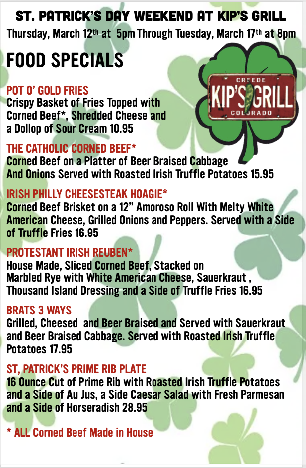 St. Patrick's Day Tuesday, March 17, 2026 11:00 AM 8:00 PM 11:00 20:00 Kip's Grill 101 E 5th St Creede, CO, 81130 United States (map) Google Calendar ICS